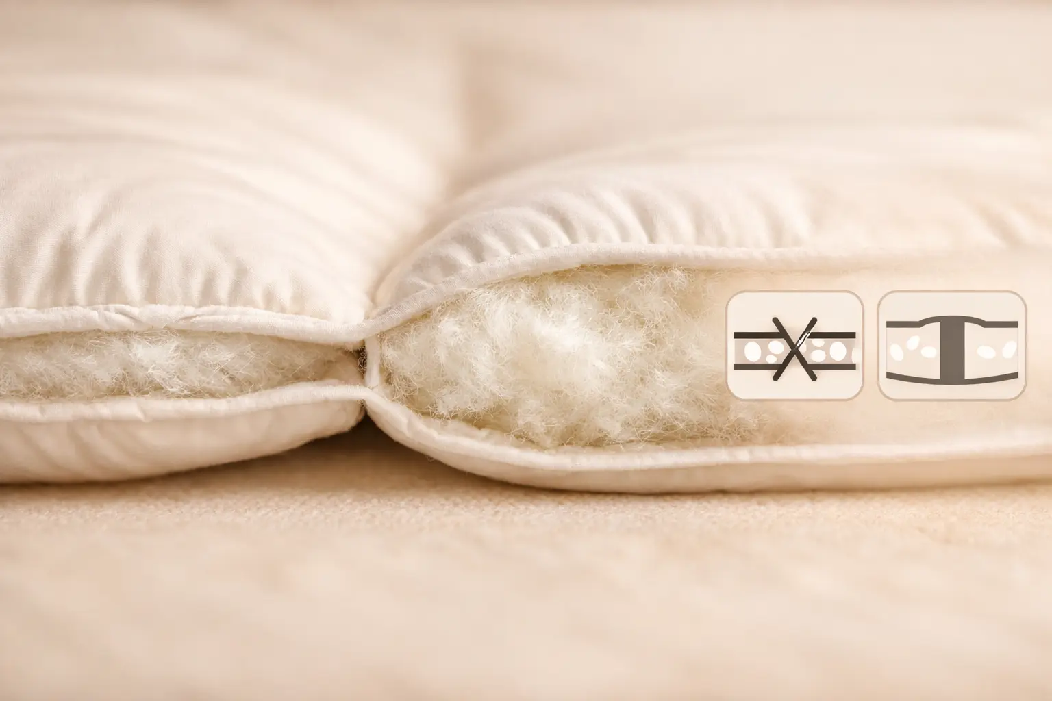 Со временем пух может начать мигрировать через проколы иглы, если плотность ткани чехла (тик, батист) ниже стандарта.