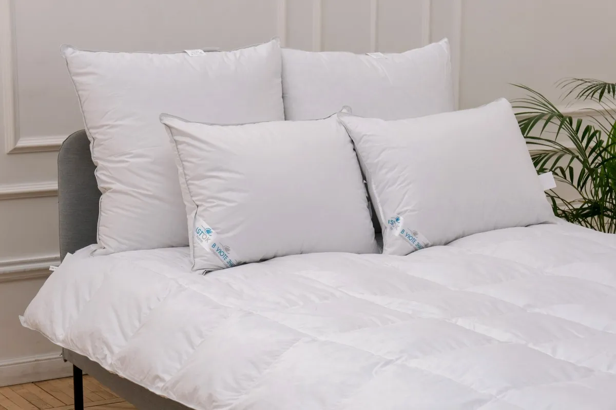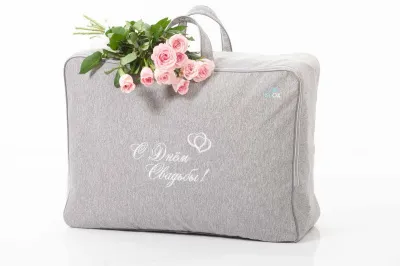 В комплект входят две пуховые подушки и лёгкое пуховое одеяло, выполненные из белоснежного сатин-атласа с элегантной вышивкой «С днём свадьбы». Натуральный пух обеспечивает нежную мягкость, лёгкость и идеальный микроклимат во время сна, даря комфорт в любое время года. Роскошная ткань сатин-атлас радует шелковистым блеском, прочностью и долговечностью, прекрасно удерживает наполнитель и сохраняет безупречный вид даже после длительного использования.