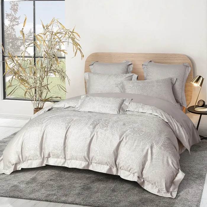 Комплект выполнен из египетского хлопка, известного своей особой мягкостью, шелковистой гладкостью и повышенной прочностью. Длинноволокнистое волокно обеспечивает ткани исключительную износостойкость и способность надолго сохранять насыщенность оттенков. Светло-серый фон с деликатным жаккардовым узором напоминает морозные узоры на стекле, создавая атмосферу северной чистоты и спокойствия. Египетский хлопок прекрасно пропускает воздух, остаётся нежным к коже и гарантирует комфорт в любое время года.