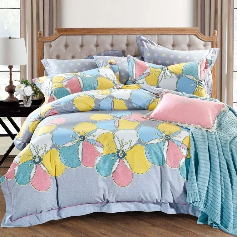 Комплект выполнен из сатина из 100% хлопка, известного своей шелковистой гладкостью, мягким благородным блеском и отличной воздухопроницаемостью. На нежно-голубом фоне распустились крупные цветы в радужной палитре – солнечно-жёлтые, небесно-голубые и нежно-розовые лепестки создают атмосферу весенней свежести и лёгкости. Сатиновое переплетение придаёт ткани повышенную прочность и долговечность, сохраняя яркость красок даже после многочисленных стирок.