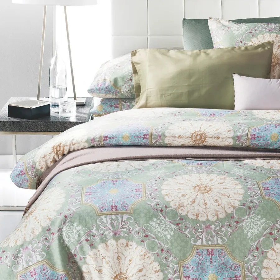 Выполненный из 100% египетского хлопка, он поражает мягкостью, гладкостью и лёгким шелковистым блеском, обеспечивая идеальный комфорт во время сна. Нежно-зелёный фон с утончёнными узорами в кофейно-бежевых и пастельно-голубых тонах создаёт атмосферу спокойствия и аристократической роскоши. Прочная ткань прекрасно пропускает воздух, устойчива к выцветанию и сохраняет яркость красок даже после множества стирок.
