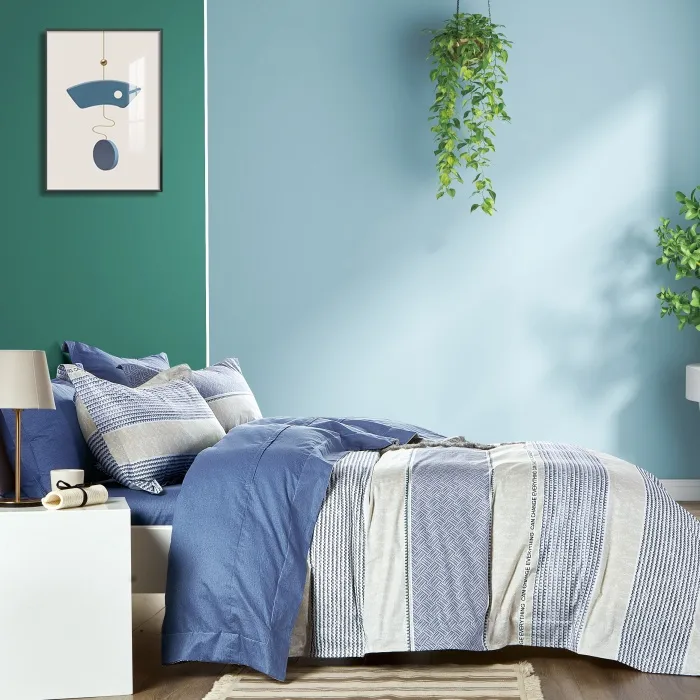 Комплект выполнен из сатина из 100% хлопка, который отличается шелковистой гладкостью, мягким благородным блеском и превосходной воздухопроницаемостью. Комбинация глубоких синих и светлых серо-бежевых тонов дополнена лаконичным геометрическим рисунком и контрастными полосами, создающими динамичный и элегантный образ спальни. Сатиновое переплетение обеспечивает повышенную прочность ткани, её износостойкость и сохранение яркости красок даже после множества стирок.