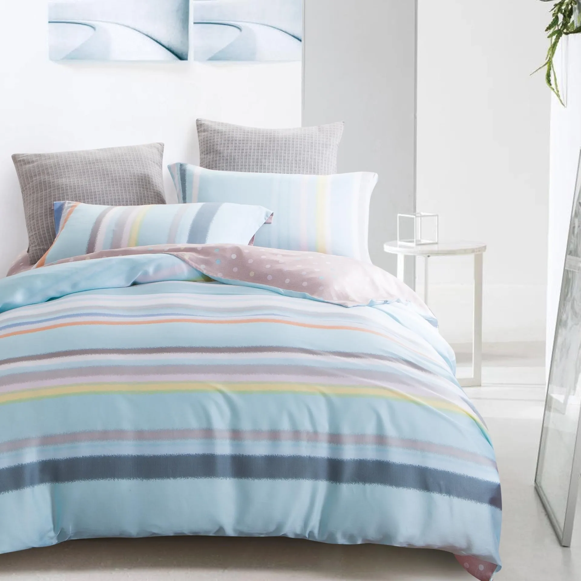 Изготовленный из экологичного тенселя, он радует нежной шелковистой текстурой, мягким блеском и высокой прочностью. Ткань прекрасно дышит, отводит влагу и сохраняет прохладу в жаркие ночи, обеспечивая уют и здоровый микроклимат круглый год. Нежно-голубой фон украшен мягкими разноцветными полосами пастельных оттенков, создающими атмосферу радости и лёгкости. Материал устойчив к выцветанию, сохраняет форму и гладкость даже после множества стирок.
