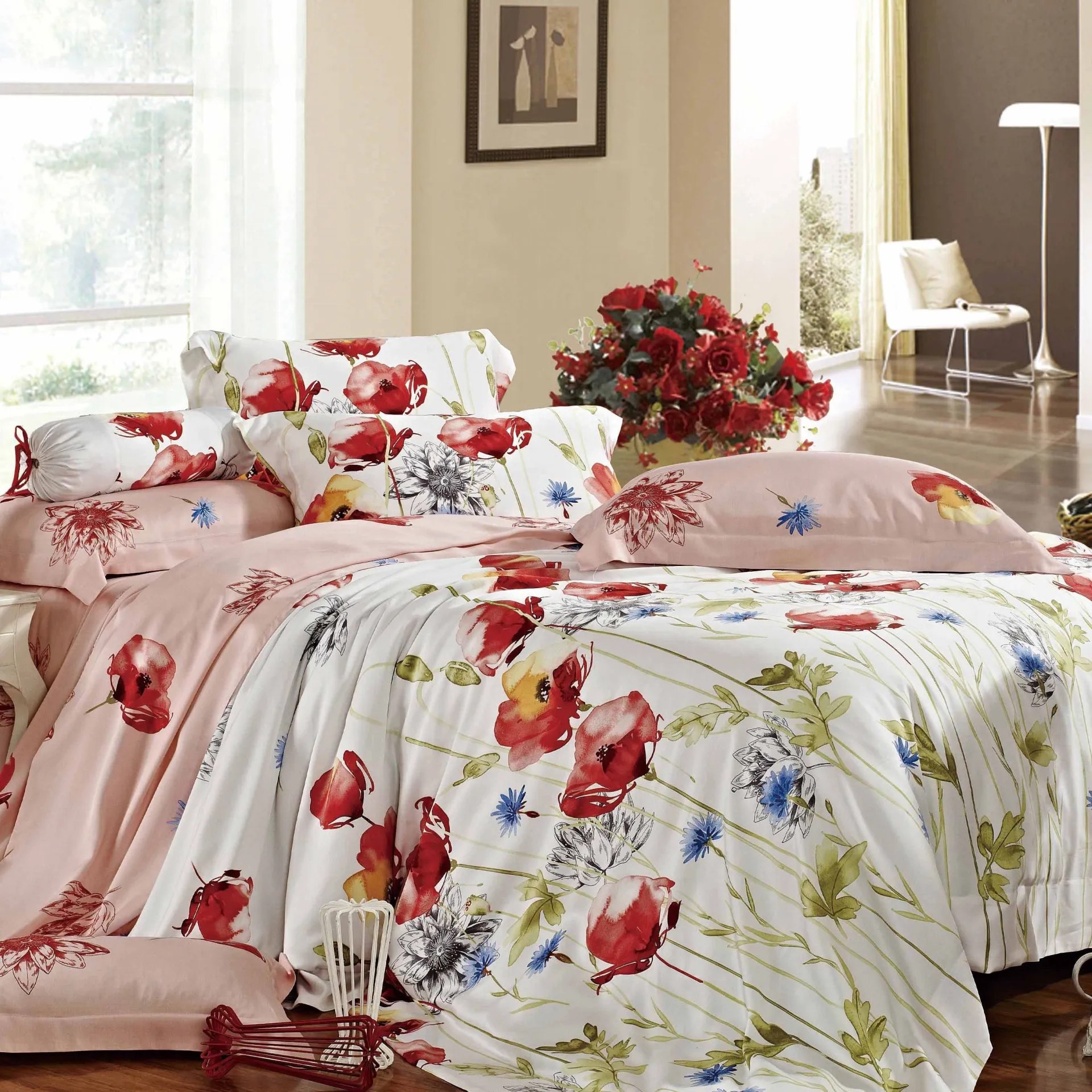 Изготовленный из нежного тенселя, он отличается шелковистой гладкостью, мягким блеском и исключительной прочностью. Ткань прекрасно дышит, быстро впитывает влагу и поддерживает оптимальную температуру, обеспечивая уют и свежесть в любое время года. Белоснежный фон с живописным цветочным принтом в красно-алых, голубых и зелёных тонах создаёт атмосферу цветущего сада и наполняет спальню радостью и светом. Материал устойчив к выцветанию и сохраняет идеальную гладкость даже после множества стирок.