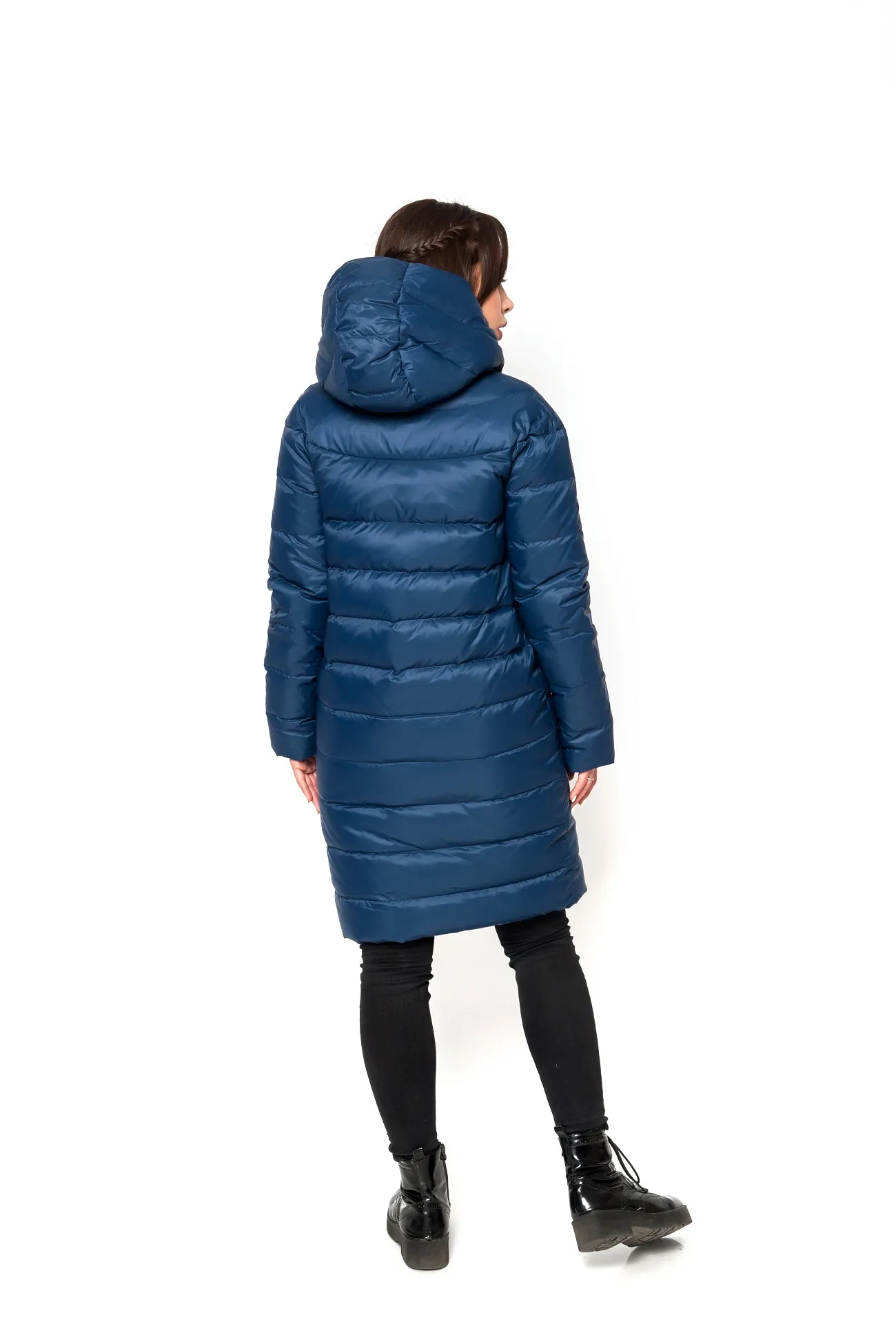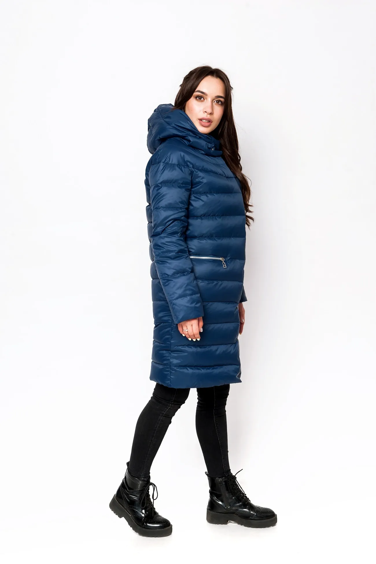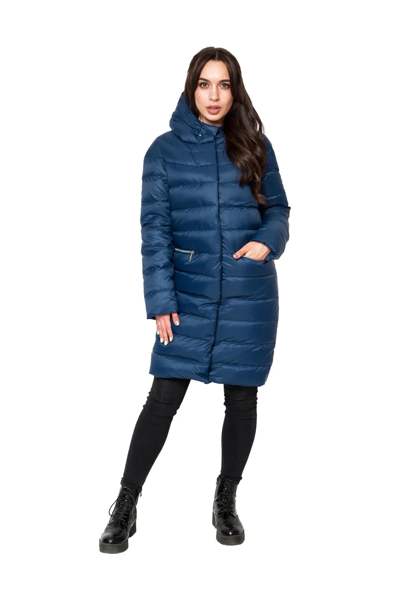 Прямой удлиненный крой визуально стройнит фигуру, позволяя свободно комбинировать пуховик с джинсами, брюками или теплым платьем. Удобный капюшон с высоким воротником защищает голову и шею от ветра и снега, а застежка на молнию с планкой препятствует проникновению холодного воздуха.