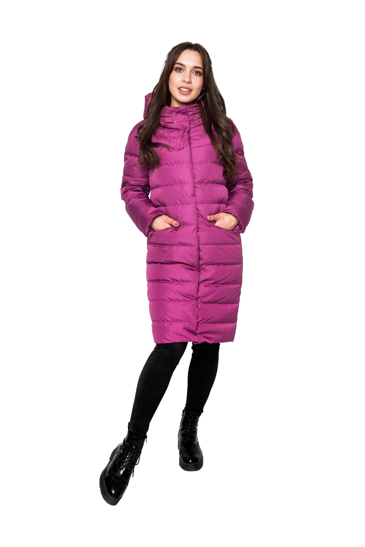 Продуманное расположение горизонтальных прострочек равномерно распределяет пух, предотвращая его смещение и создавая аккуратный рельефный силуэт. Боковые карманы на молнии надежно сохраняют мелочи и согревают руки.