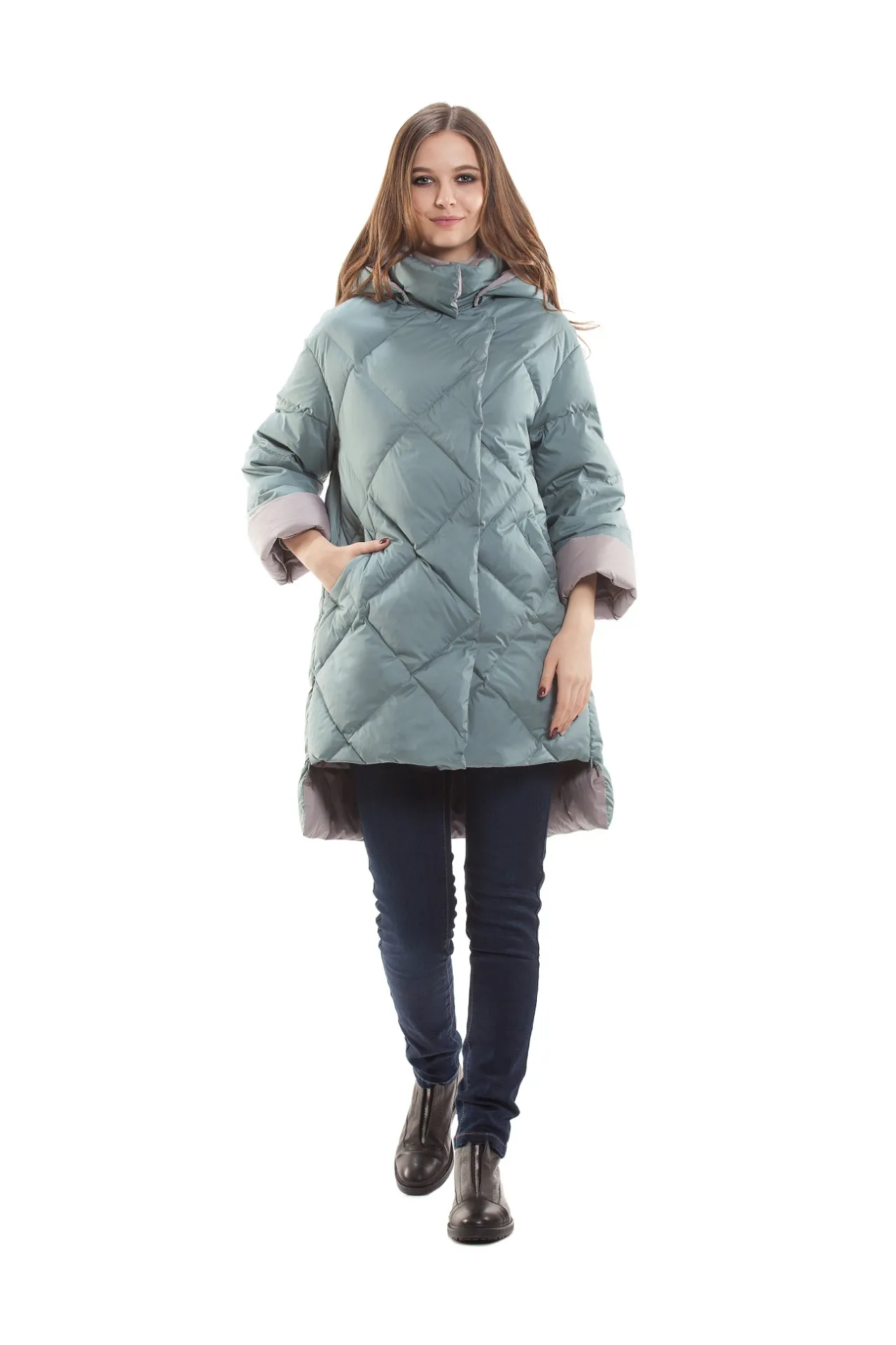 Верх выполнен из прочного, но мягкого материала с водоотталкивающей пропиткой, которая защищает от ветра и лёгких осадков. Оригинальная диагональная стёжка придаёт куртке динамичный, элегантный вид и визуально вытягивает силуэт, создавая утончённый образ. Свободный крой с асимметричной линией низа не сковывает движения и даёт возможность сочетать модель как с джинсами, так и с более женственными нарядами.