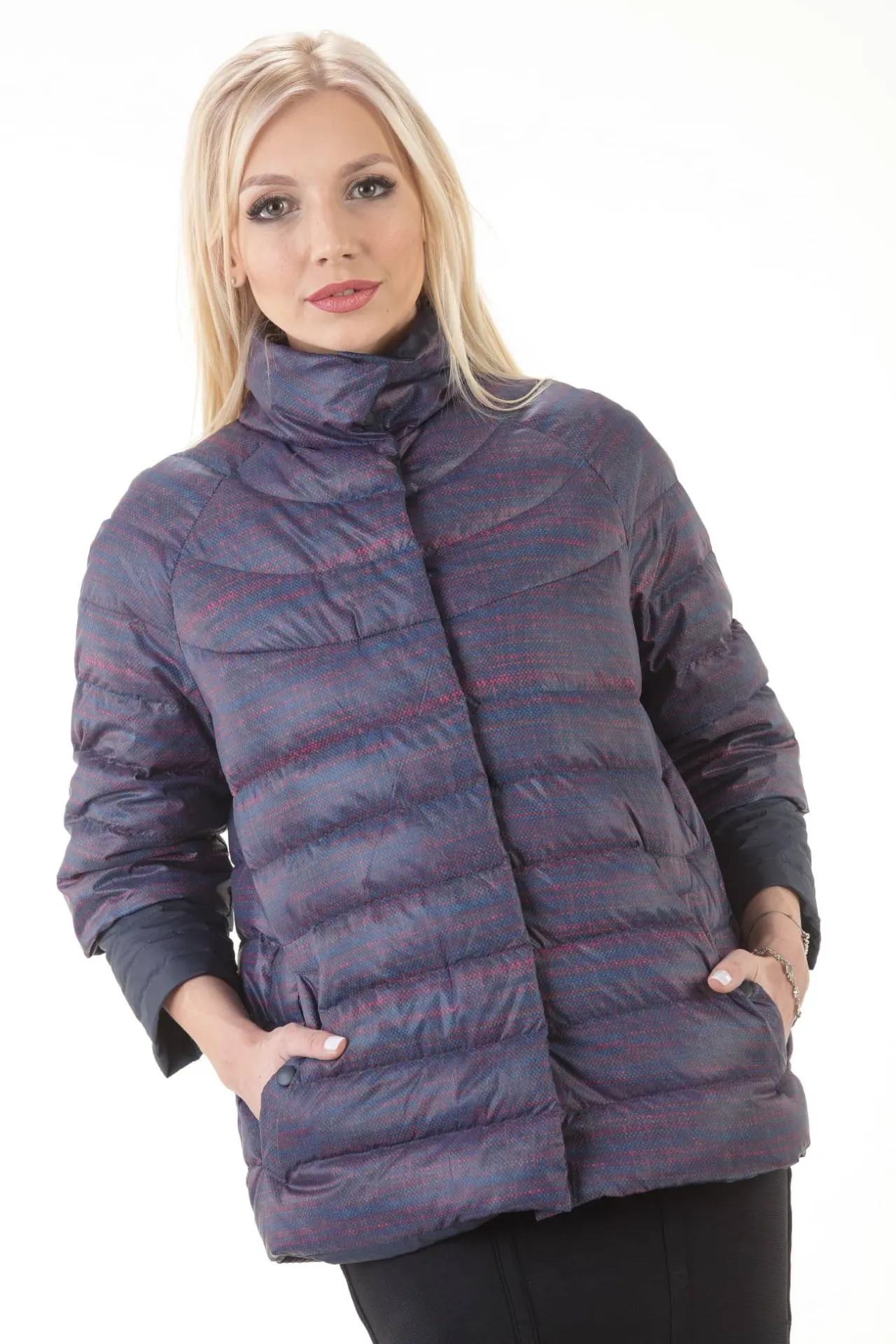 Верх выполнен из прочного современного материала с водо- и ветроотталкивающей пропиткой, что делает куртку практичной в условиях переменчивой погоды. Лаконичный прямой силуэт с горизонтальной стёжкой формирует аккуратный объём и подчёркивает изящество фигуры, а высокий воротник защищает от прохладного ветра. Удобные боковые карманы добавляют практичности, сохраняя руки в тепле и обеспечивая место для необходимых мелочей.