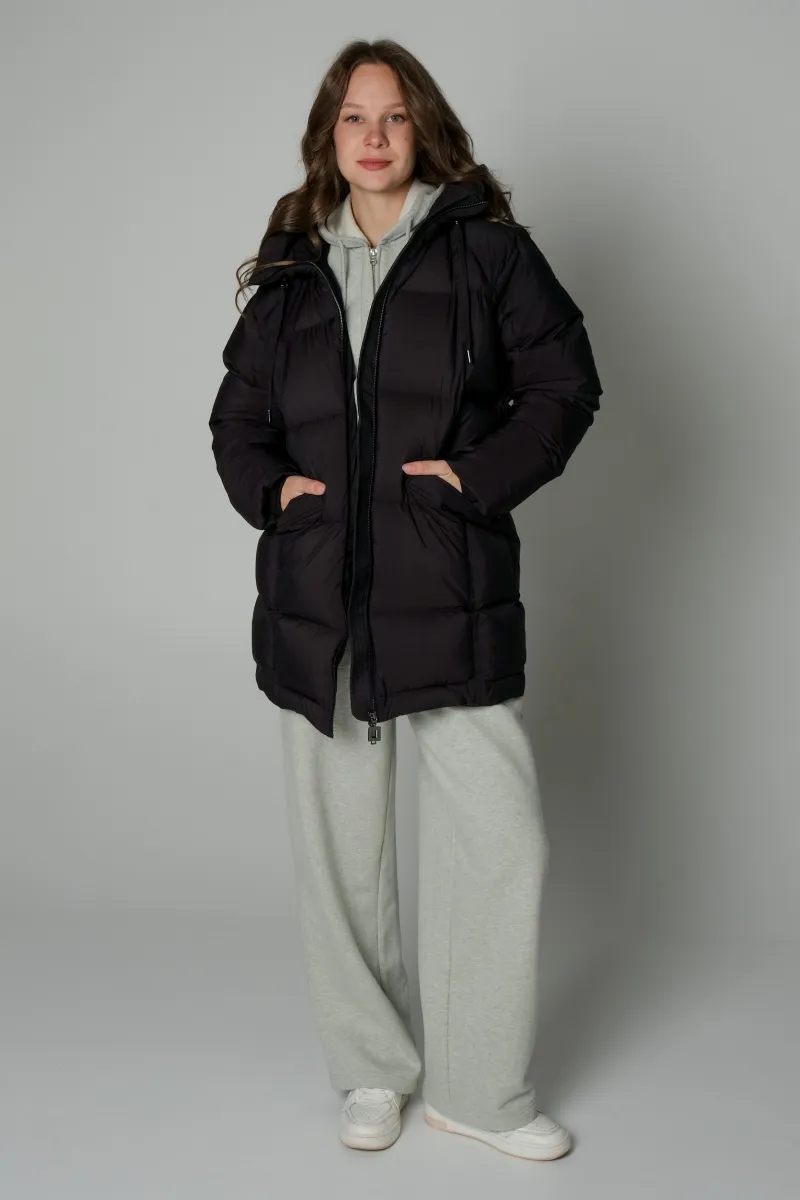 Удлинённый прямой силуэт прикрывает бёдра, обеспечивая дополнительное тепло, а регулируемый капюшон с высоким воротником защищает голову и шею от пронизывающего холода. Двухзамковая молния и глубокие карманы с клапанами делают модель практичной и удобной для повседневной носки. Лаконичный дизайн с крупной горизонтальной стёжкой придаёт куртке динамичный объём и подчёркивает современный городской стиль.