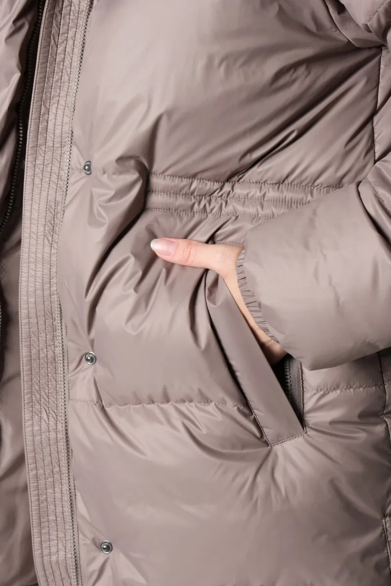 Двухзамковая молния с планкой на кнопках предотвращает проникновение холодного воздуха, а боковые карманы с мягкой подкладкой сохраняют руки в тепле и служат практичным местом для мелочей. Лаконичный дизайн с горизонтальной стёжкой визуально стройнит и подчёркивает аккуратный силуэт, делая пуховик универсальным элементом зимнего гардероба.