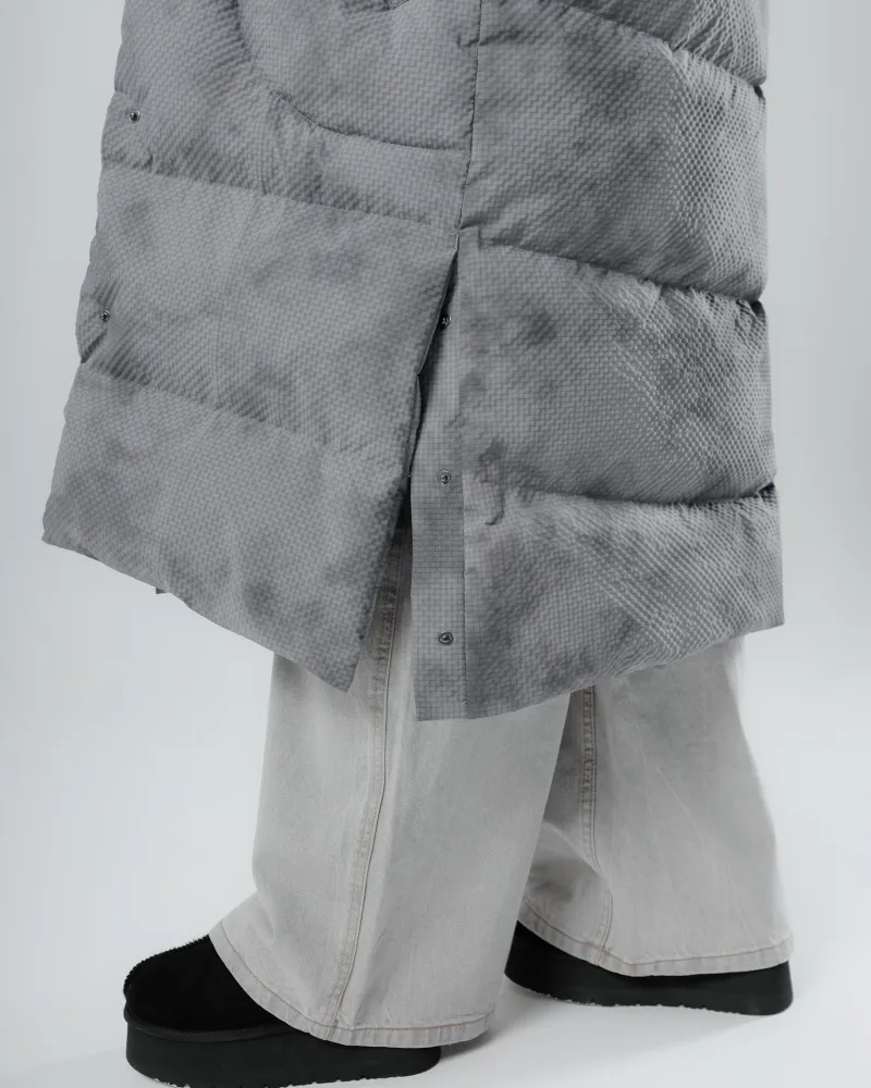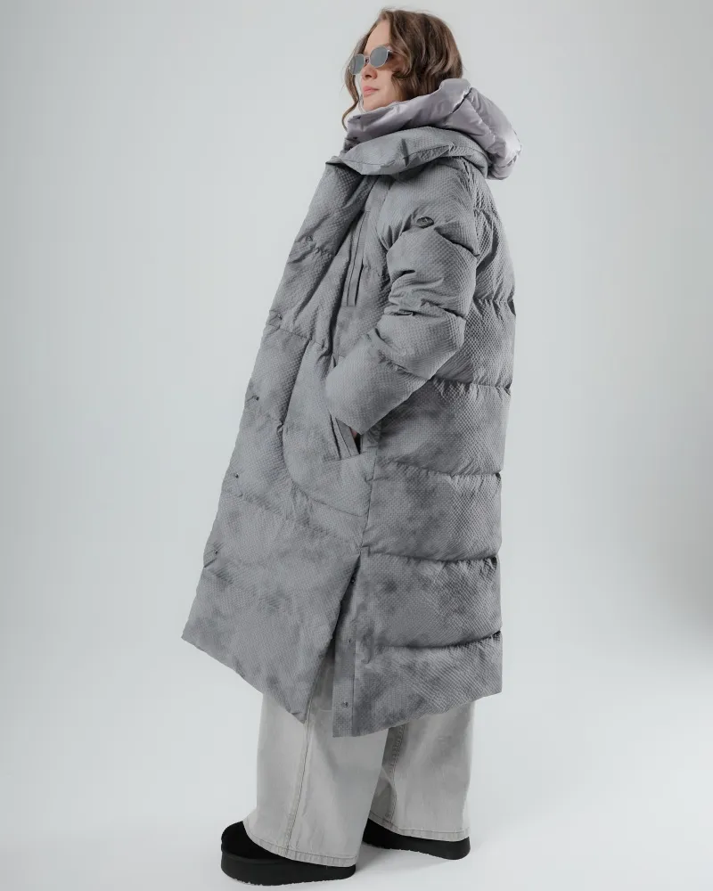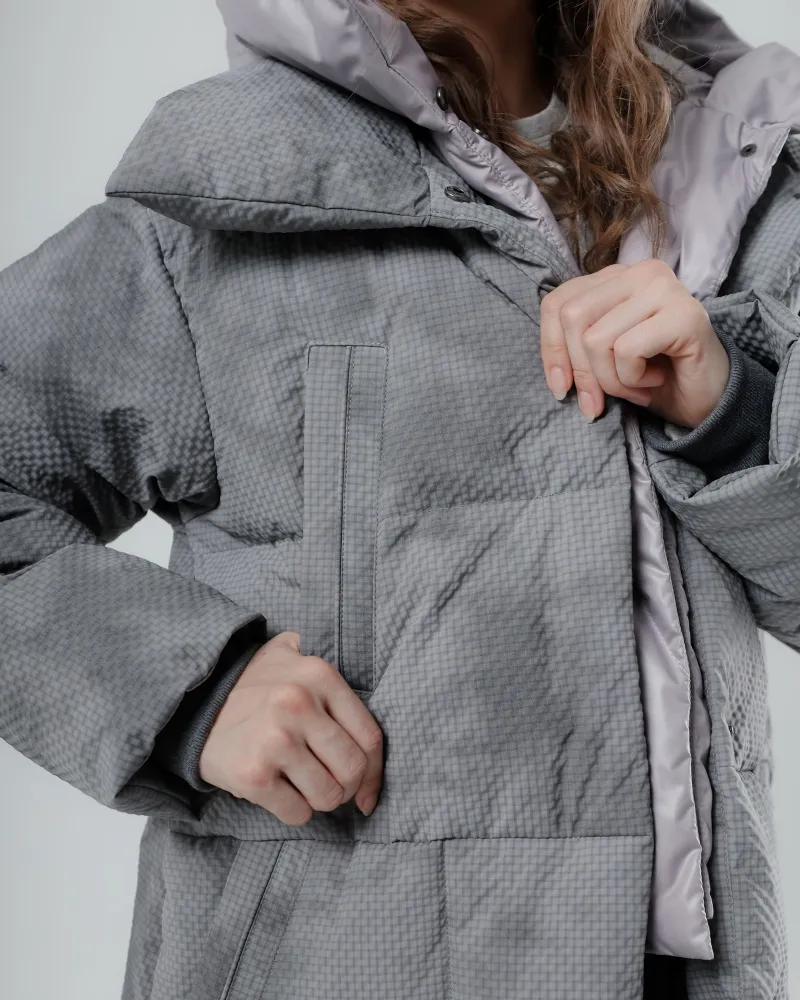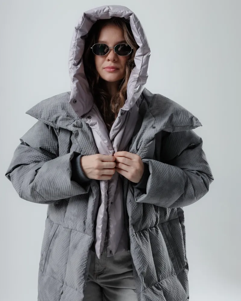 Отличительной особенностью пуховика является съемная манишка с капюшоном, которую можно легко отстегнуть при помощи удобных кнопок. Такой вариант позволяет менять образ в зависимости от ситуации – носить пуховик с дополнительной защитой или создать более лаконичный силуэт без нее.