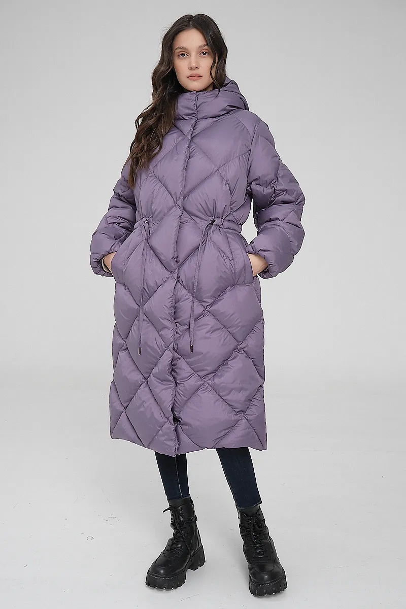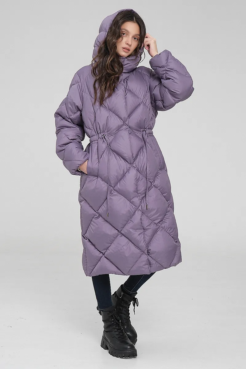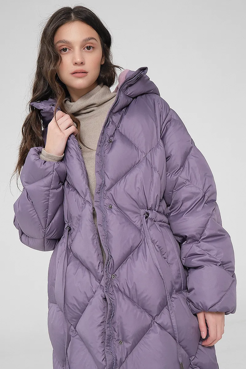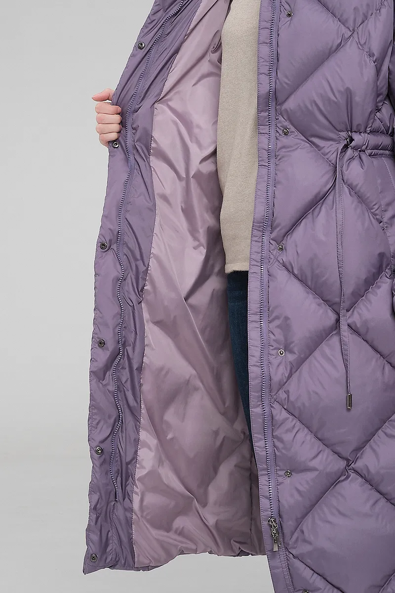 Модель выполнена из натурального 100% сибирского пуха в сочетании с качественной, непромокаемой тканью, которая отлично защищает от мороза и ветра в холодную зиму. Поэтому вам несомненно будет тепло и комфортно в любую погоду. Кулиска на талии регулируется, можно ее расслабить или затянуть потуже – как вам удобно. Стежка ромбами добавляет особую изюминку в образ, делая акцент на элегантности.