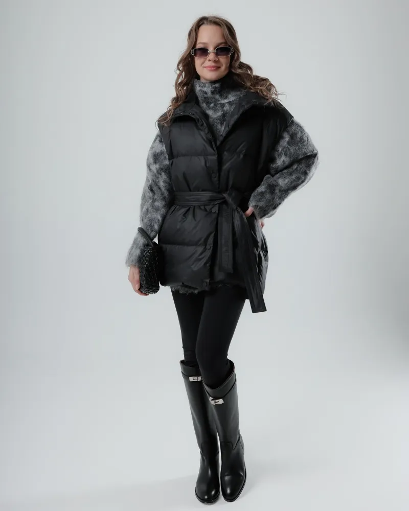 Жилет можно сочетать с трикотажным костюмом и отправиться на прогулку в парк или дополнить его элегантным платьем, что позволит выглядеть максимально женственно и привлекательно.