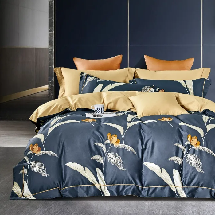 Глубокий тёмно-синий фон с утончённым цветочным принтом в кремово-золотистых и янтарных оттенках создаёт элегантный контраст и атмосферу вечерней гармонии. Тёплые золотистые наволочки и изнанка подчёркивают изысканность комплекта, придавая спальне выразительность и уют.